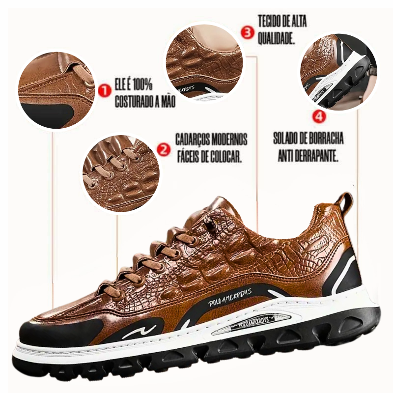 Forrado em couro premium, que controla a temperatura dos pés e evita mal cheiros. Além de evitar lesões causadas por atritos.